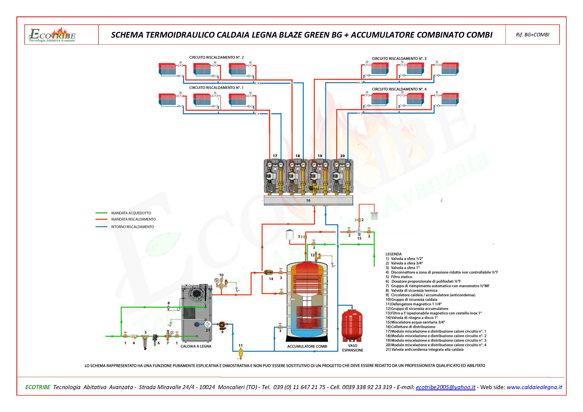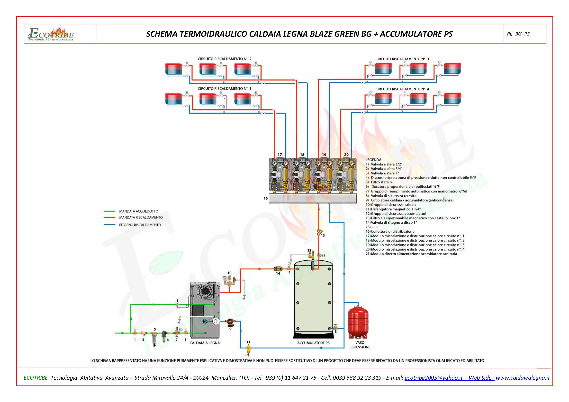 SCHEMA TERMO IDRAULICO CALDAIA LEGNA + PUFFERSchema circuito termo idraulico con caldaia alimentata a legna con gassificazione a fiamma inversa BLAZE GREEN BG abbinata ad un accumulatore termico inerziale (Puffer) per solo riscaldamento.