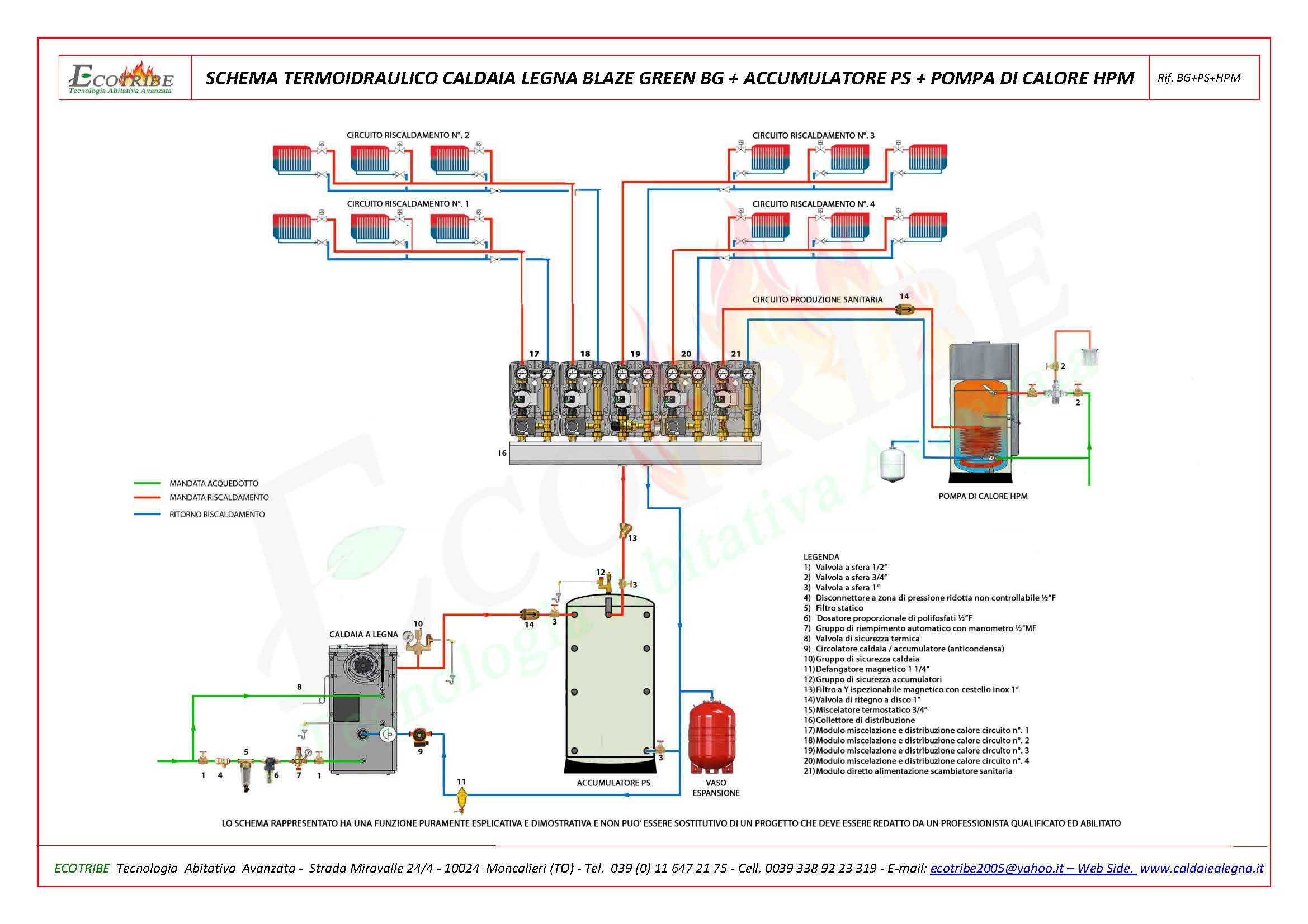 SCHEMA TERMO IDRAULICO CALDAIA LEGNA + PUFFER + SCALDAACQUA IN POMPA DI CALORE HPMSchema circuito termo idraulico con caldaia alimentata a legna con gassificazione a fiamma inversa BLAZE GREEN BG abbinata ad un accumulatore termico inerziale (Puffer) per solo riscaldamento e ad una pompa di calore con un solo scambiatore a serpentino per la produzione di acqua sanitaria.