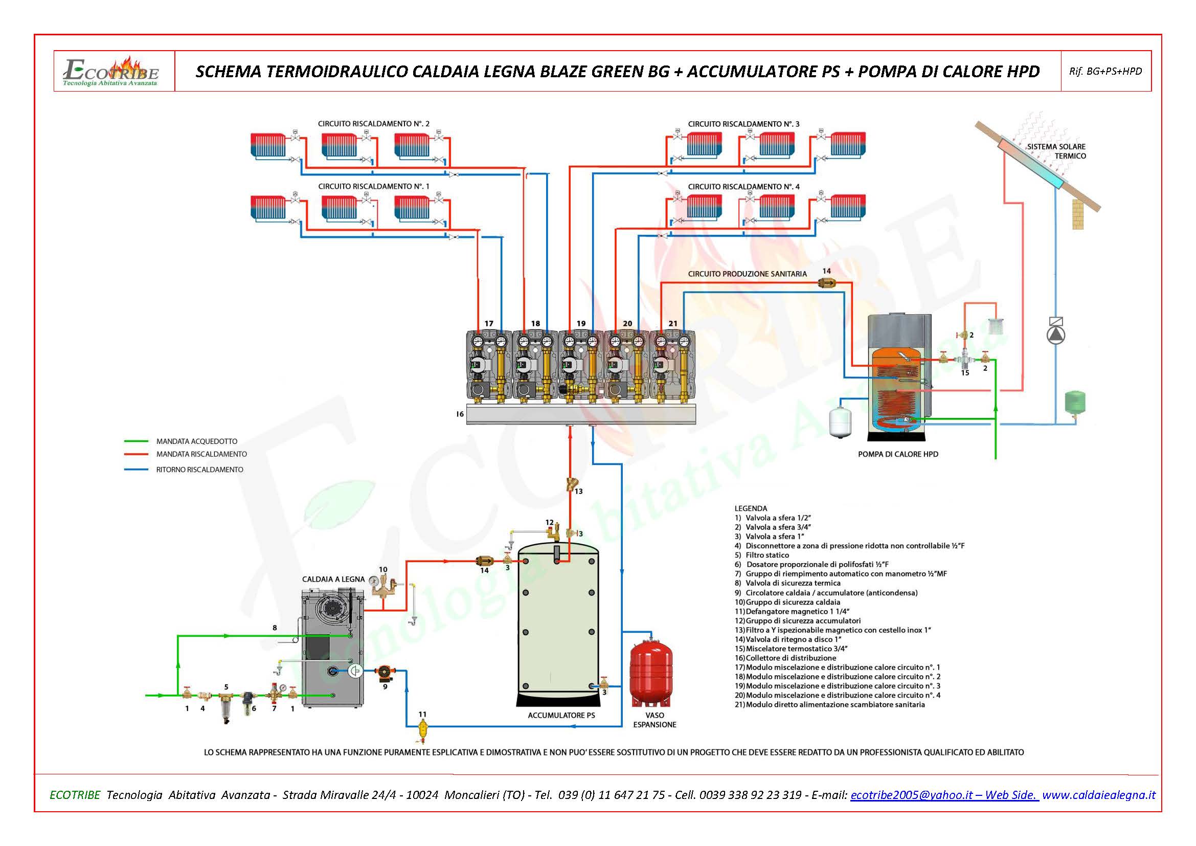 SCHEMA TERMO IDRAULICO CALDAIA LEGNA + PUFFER + SCALDAACQUA IN POMPA DI CALORE HPDSchema circuito termo idraulico con caldaia alimentata a legna con gassificazione a fiamma inversa BLAZE GREEN BG abbinata ad un accumulatore termico inerziale (Puffer) per solo riscaldamento e ad una pompa di calore con doppio scambiatore a serpentino, uno per la produzione di acqua sanitaria e l'altro per l'integrazione con un sistema solare termico o con un generatore secondario.