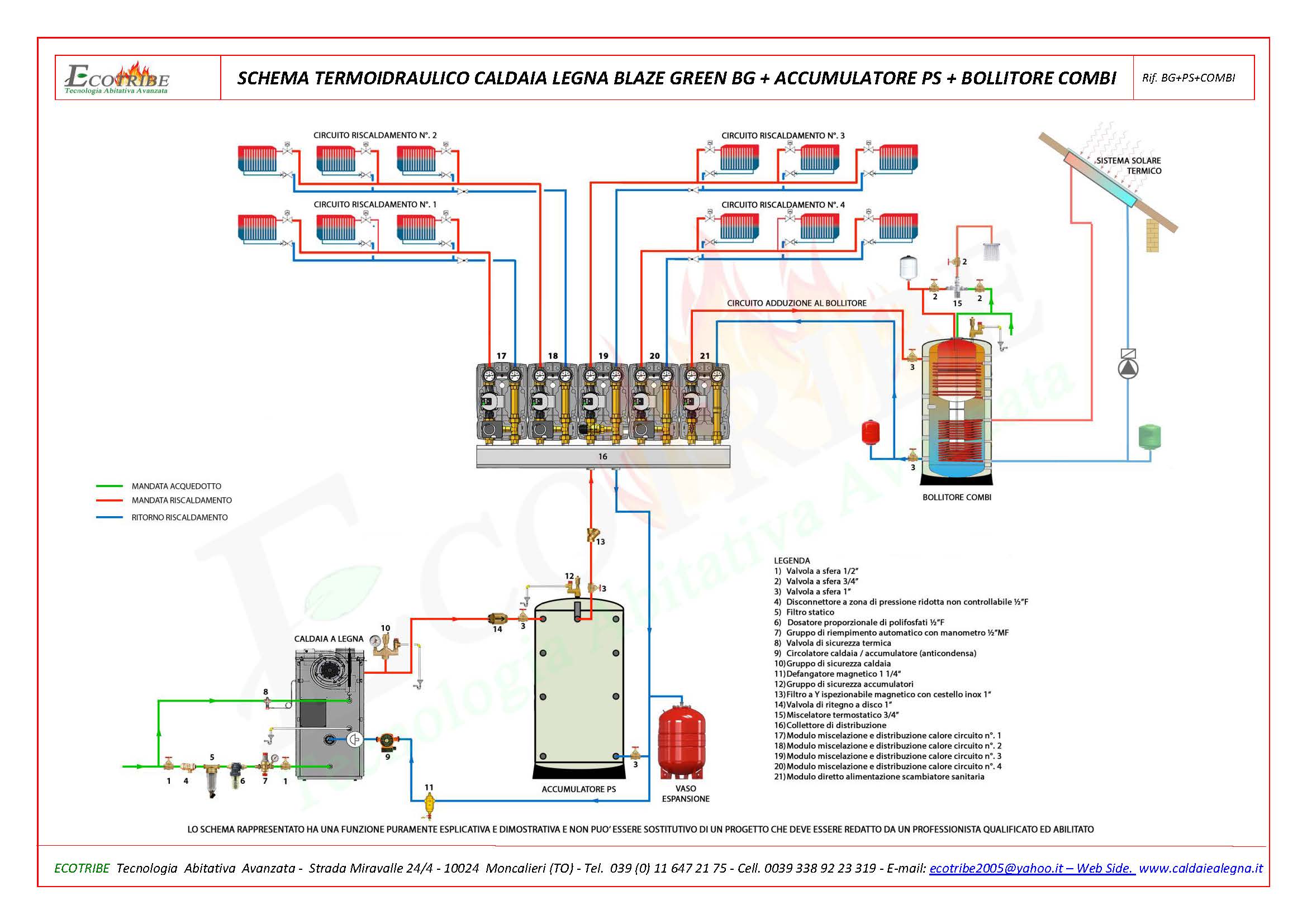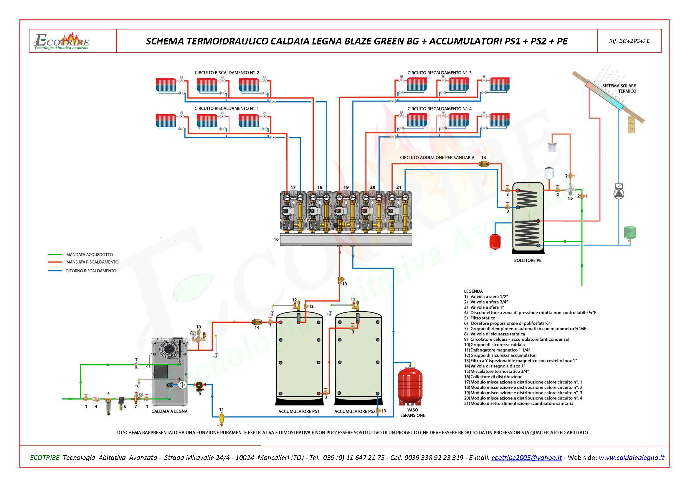 SCHEMA TERMO IDRAULICO CALDAIA LEGNA + ACCUMULATORI TERMICI PS1+PS2 + BOLLITORE PESchema circuito termo idraulico con caldaia alimentata a legna con gassificazione a fiamma inversa BLAZE GREEN BG abbinata ad un accumulatore termico combinato per riscaldamento e produzione di acqua sanitaria secondo il sistema "SPIRA". L'accumulatore combinato TOTAL, oltre a servire al riscldamento, serve per la produzione di acqua sanitaria in continuo; qualora venga scelto il modello con due scambiatori si potrà collegare su uno scambiatore un generatore di calore secondario e sull'altro un sistema di pannelli solari termici. Il bolitore è predisposto a ricevere una resistenza per l'eventuale collegamento ad un sistema di pannelli fotovoltaici.
