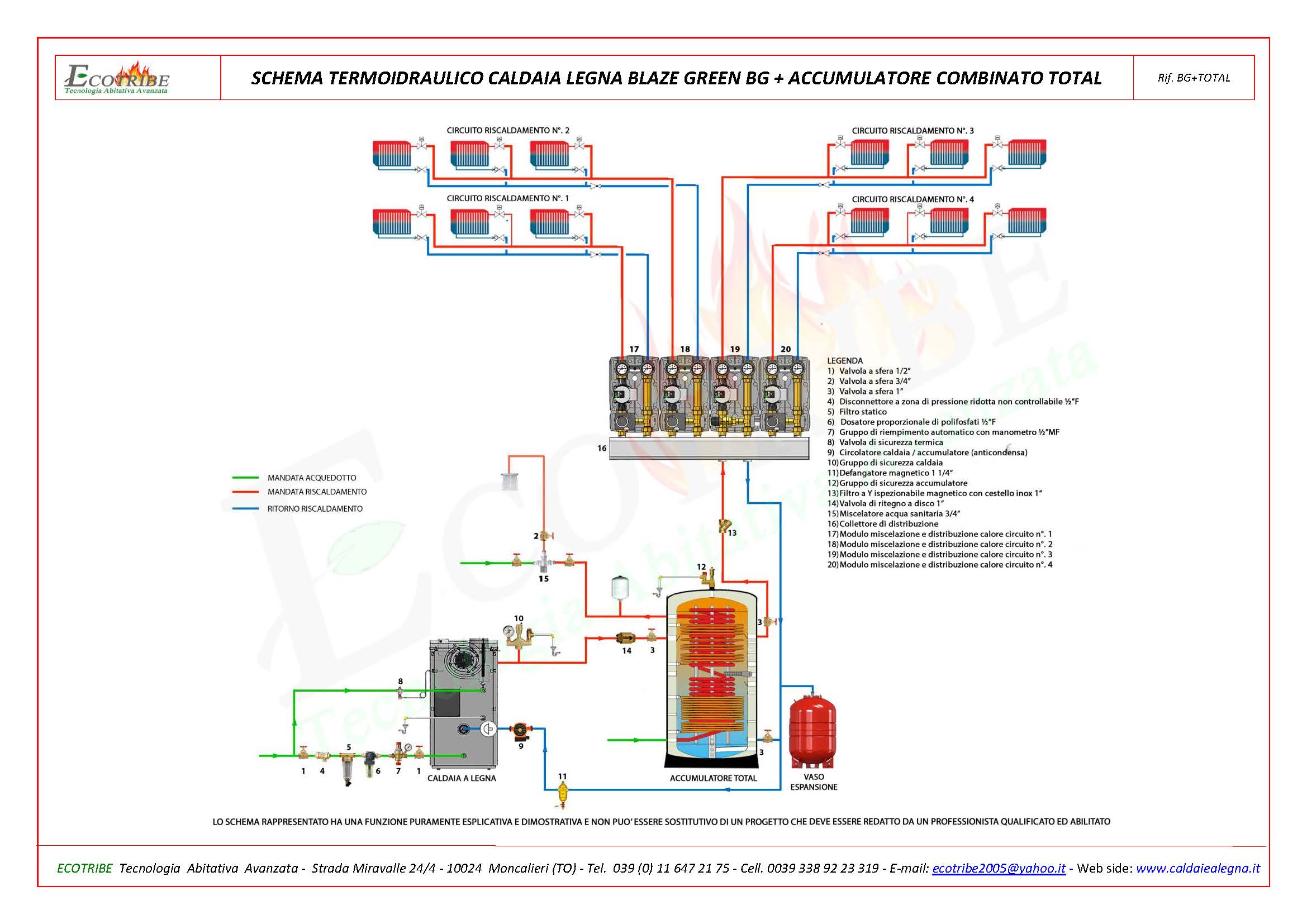 SCHEMA TERMOIDRAULICO CALDAIA LEGNA + ACCUMULATORE COMBINATO "SPIRA"Schema circuito termo idraulico con caldaia alimentata a legna con gassificazione a fiamma inversa BLAZE GREEN BG abbinata ad un accumulatore termico combinato per riscaldamento e produzione di acqua sanitaria secondo il sistema "SPIRA". L'accumulatore combinato TOTAL, oltre a servire al riscldamento, serve per la produzione di acqua sanitaria in continuo; qualora venga scelto il modello con due scambiatori si potrà collegare su uno scambiatore un generatore di calore secondario e sull'altro un sistema di pannelli solari termici. Il bolitore è predisposto a ricevere una resistenza per l'eventuale collegamento ad un sistema di pannelli fotovoltaici.