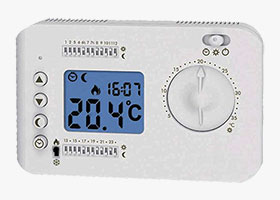 Cronotermostato per regolazione a punto fissoNegli impianti più semplici e meno performanti viene utilizzato un cronotermostato funzionante in modalità ON/OFF, cioè attiva o spegne l’impianto di riscaldamento, agendo sul circolatore, a seconda della temperatura impostata nell’ambiente domestico. Per la temperatura di mandata dell’acqua il valore viene impostato manualmente agendo su una valvola miscelatrice termostatizzata.