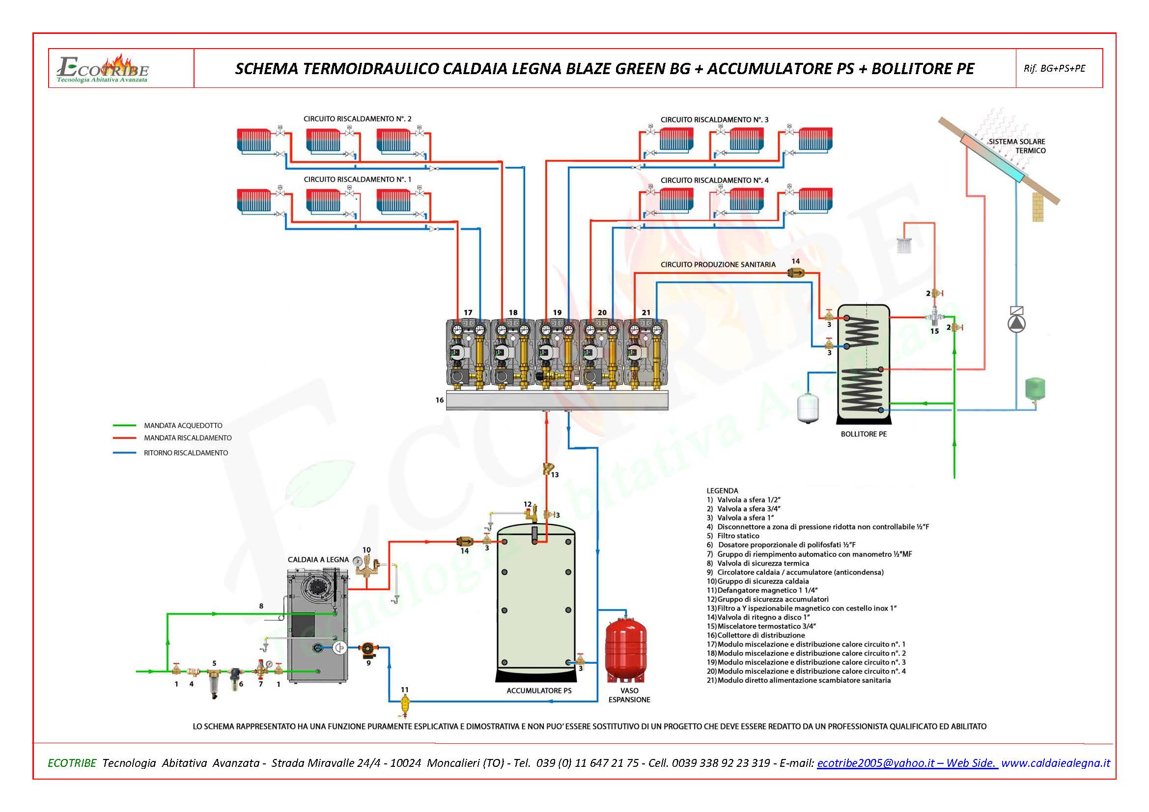 SCHEMA TERMO IDRAULICO CALDAIA LEGNA + ACCUMULATORI TERMICI PS1+PS2 + BOLLITORE PESchema circuito termo idraulico con caldaia alimentata a legna con gassificazione a fiamma inversa BLAZE GREEN BG abbinata ad un accumulatore termico combinato per riscaldamento e produzione di acqua sanitaria secondo il sistema "SPIRA". L'accumulatore combinato TOTAL, oltre a servire al riscldamento, serve per la produzione di acqua sanitaria in continuo; qualora venga scelto il modello con due scambiatori si potrà collegare su uno scambiatore un generatore di calore secondario e sull'altro un sistema di pannelli solari termici. Il bolitore è predisposto a ricevere una resistenza per l'eventuale collegamento ad un sistema di pannelli fotovoltaici.