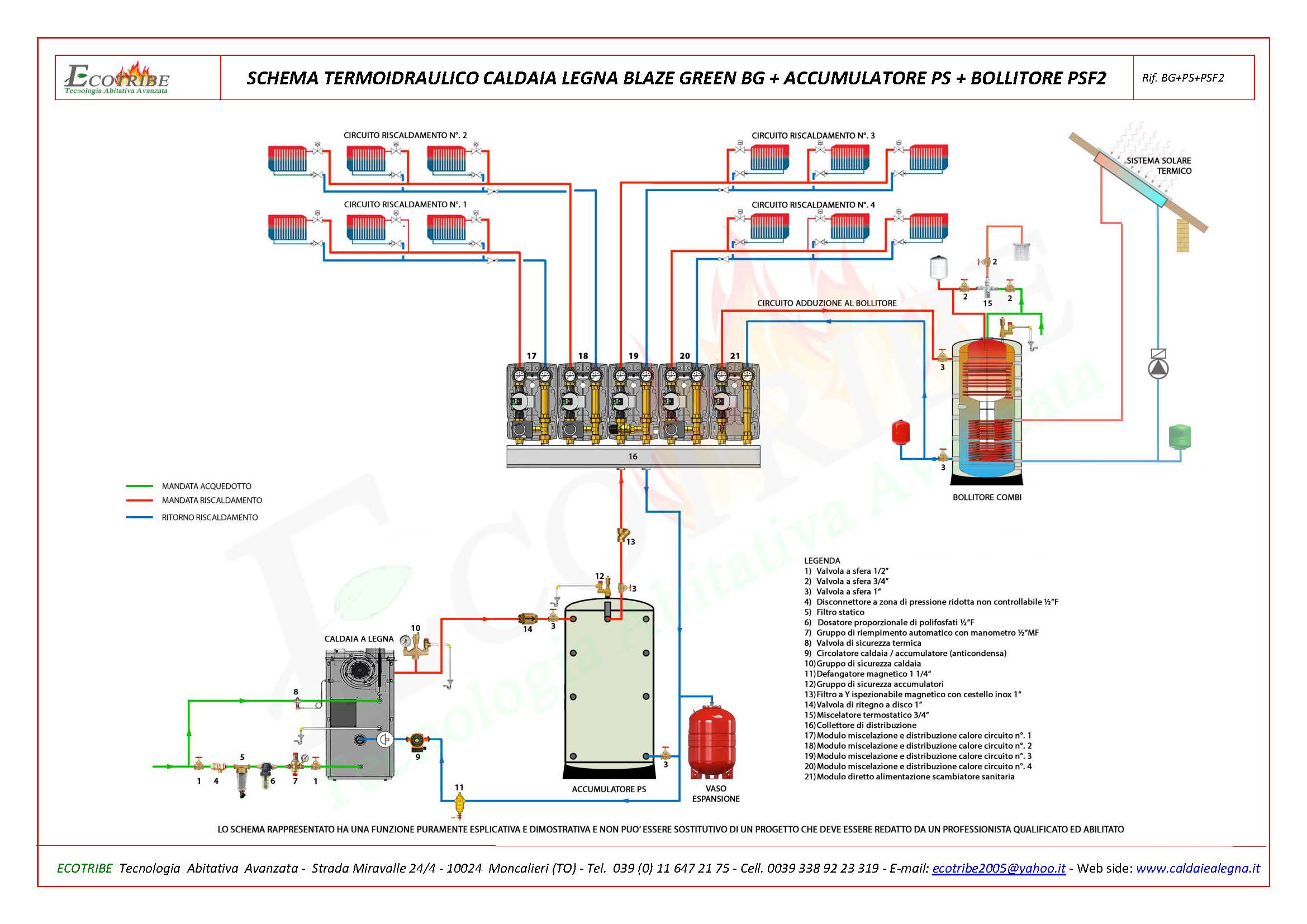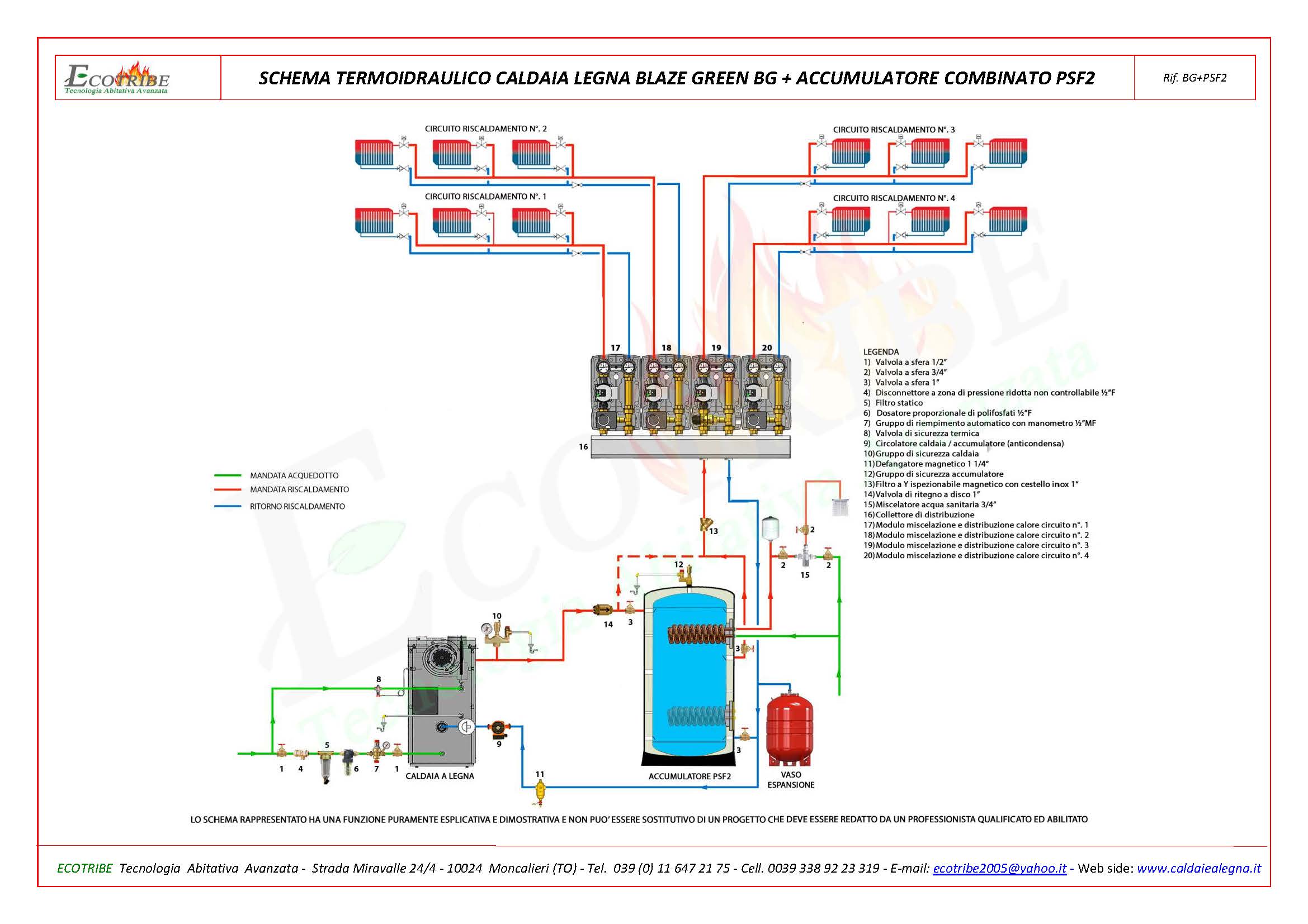 SCHEMA TERMOIDRAULICO CALDAIA LEGNA + ACCUMULATORE COMBINATO PSF2Schema circuito termo idraulico con caldaia alimentata a legna con gassificazione a fiamma inversa BLAZE GREEN BG abbinata ad un accumulatore termico combinato per riscaldamento e produzione di acqua sanitaria secondo il principio di produzione in contuno. Il puffer viene fornito con due flange a cui possono essere applicati due scambiatori a serpentino in rame, uno per collegare un eventuale secondo generatore di calore ed il secondo per collegare un sistema di pannelli solari termici. E' predisposto a ricevere una resistenza per l'eventuale collegamento ad un sistema di pannelli fotovoltaici.
