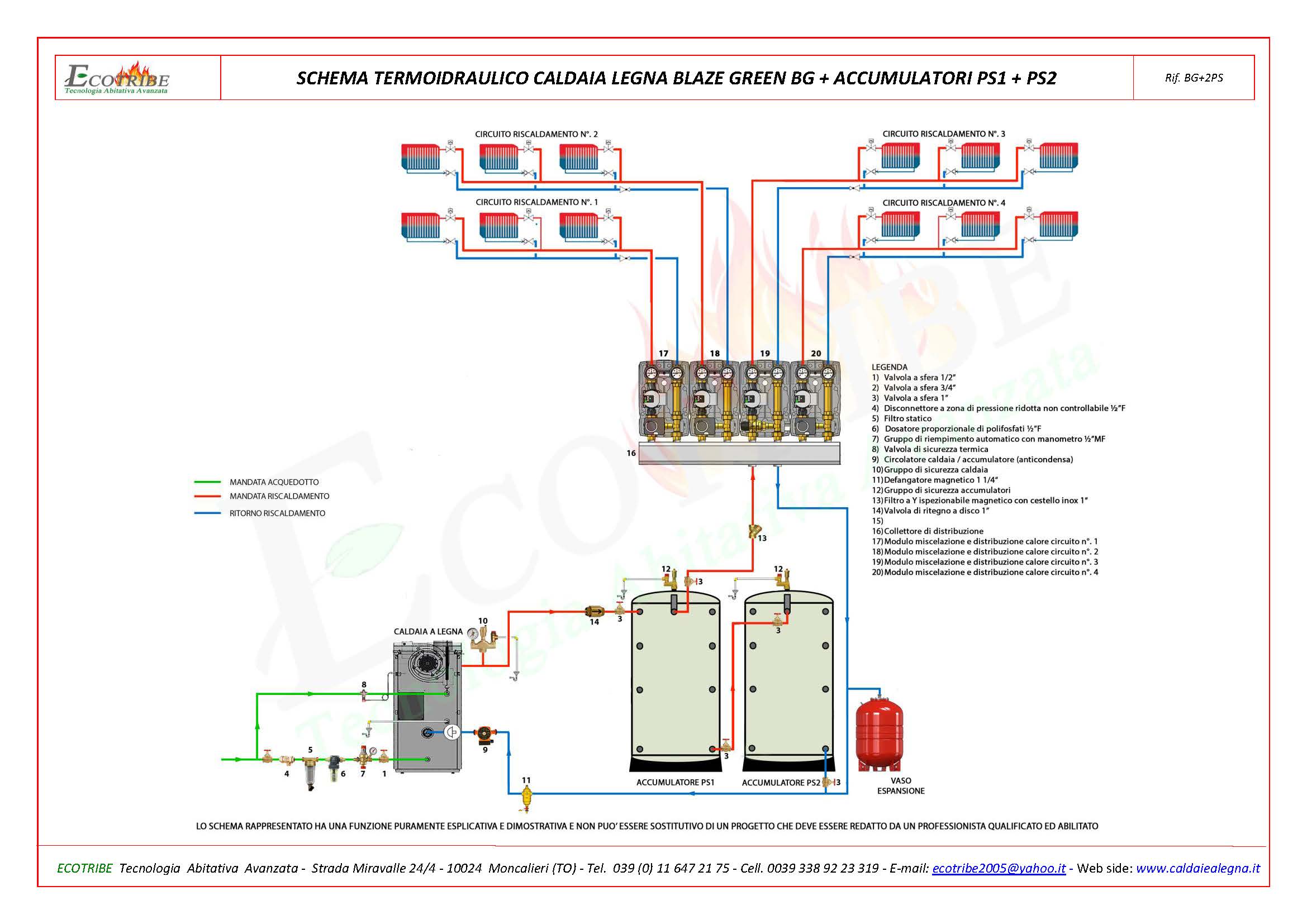 SCHEMA TERMOIDRAULICO CALDAIA LEGNA + ACCUMULATORE TERMICO PS1 + PS2Schema circuito termo idraulico con caldaia alimentata a legna con gassificazione a fiamma inversa BLAZE GREEN BG abbinata ad un accumulatore termico combinato per riscaldamento e produzione di acqua sanitaria secondo il principio di produzione in contuno. Il puffer viene fornito con due flange a cui possono essere applicati due scambiatori a serpentino in rame, uno per collegare un eventuale secondo generatore di calore ed il secondo per collegare un sistema di pannelli solari termici. E' predisposto a ricevere una resistenza per l'eventuale collegamento ad un sistema di pannelli fotovoltaici.
