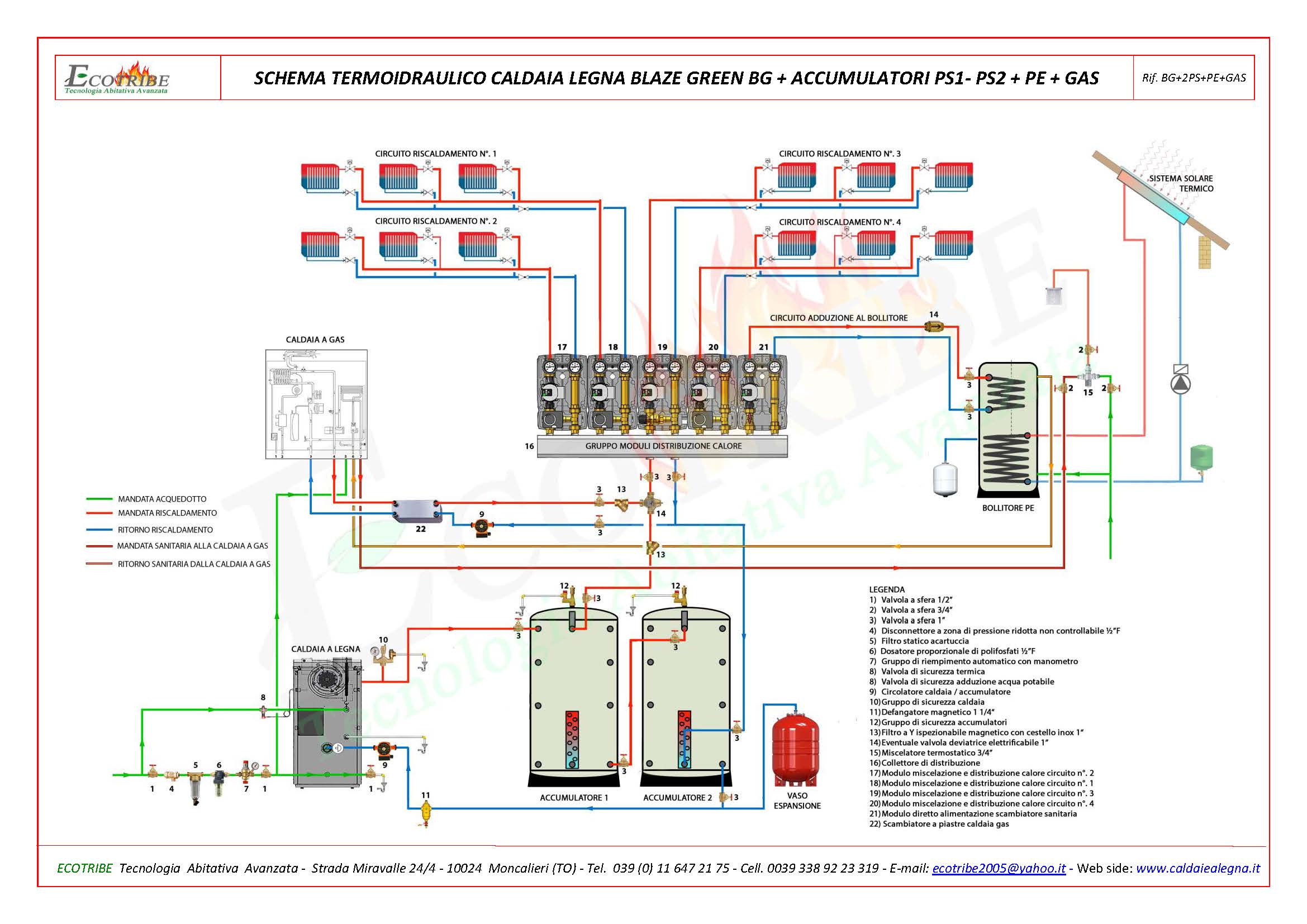 SCHEMA TERMO IDRAULICO CALDAIA LEGNA + ACCUMULATORI TERMICI PS1+PS2 + BOLLITORE PE + GASSchema circuito termo idraulico con caldaia alimentata a legna con gassificazione a fiamma inversa BLAZE GREEN BG abbinata ad un accumulatore termico combinato per riscaldamento e produzione di acqua sanitaria secondo il principio di produzione in contuno. Il puffer viene fornito con due flange a cui possono essere applicati due scambiatori a serpentino in rame, uno per collegare un eventuale secondo generatore di calore ed il secondo per collegare un sistema di pannelli solari termici. E' predisposto a ricevere una resistenza per l'eventuale collegamento ad un sistema di pannelli fotovoltaici.